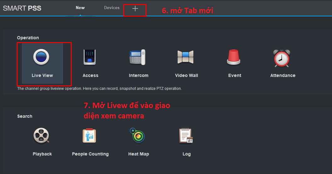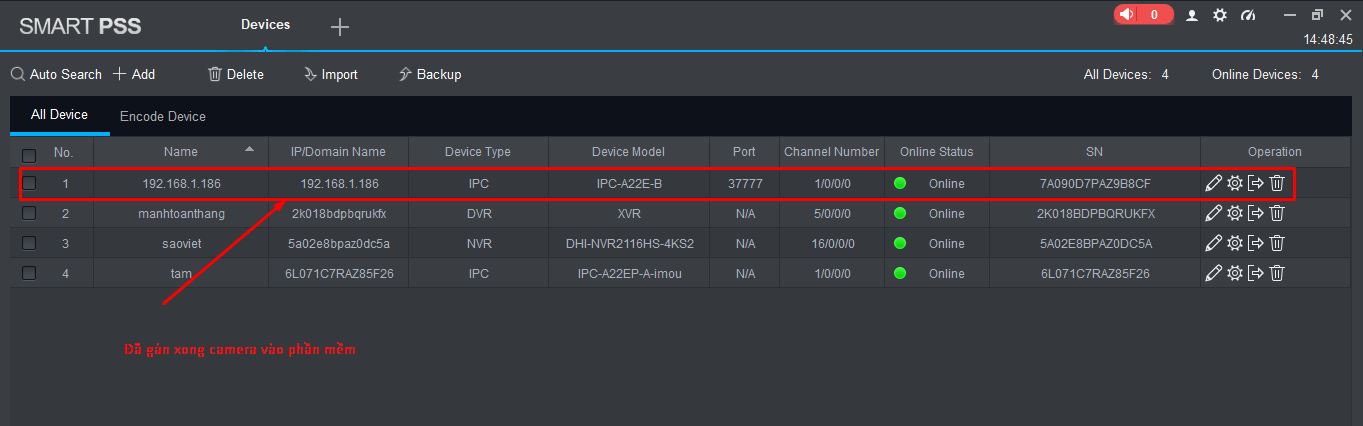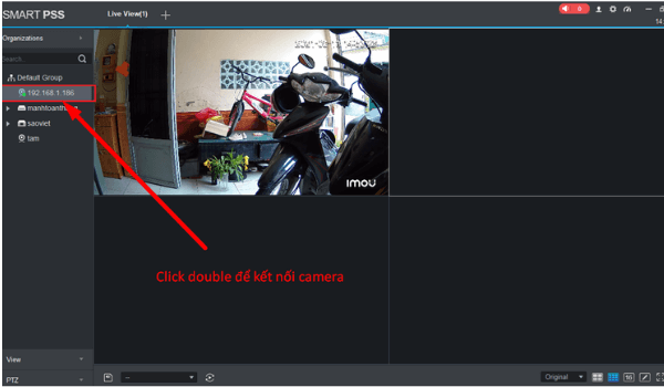 Như vậy là ta đã gán xong Camera IMOU vào phần mềm SmartPSS. Biểu tượng đèn led màu xanh là đã kết nối thành công. Bây giờ ta mở Tab Live view để xem camera trực tiếp từ phần mềm.